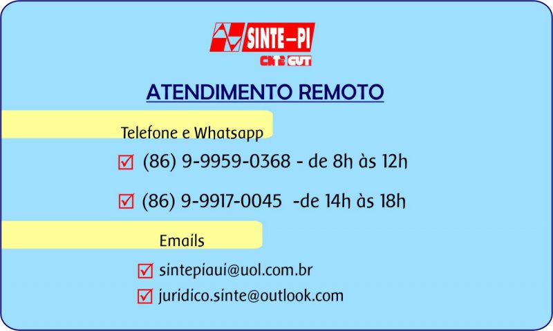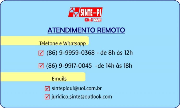 Para facilitar o contato com nossos associados, o SINTE-PI amplia o atendimento remoto, além dos emails agora também os telefones e whatsapp para os contatos e dúvidas. Observe o horário de funcionamento.