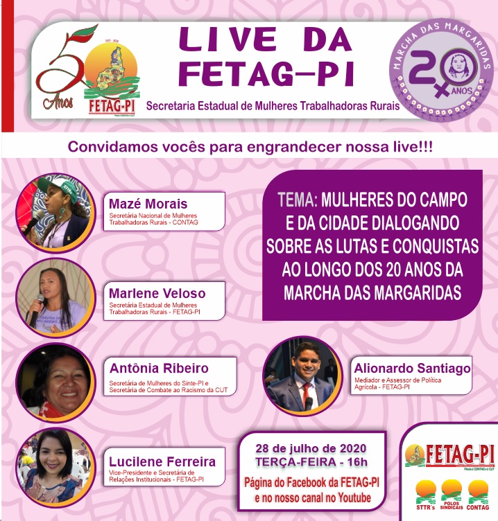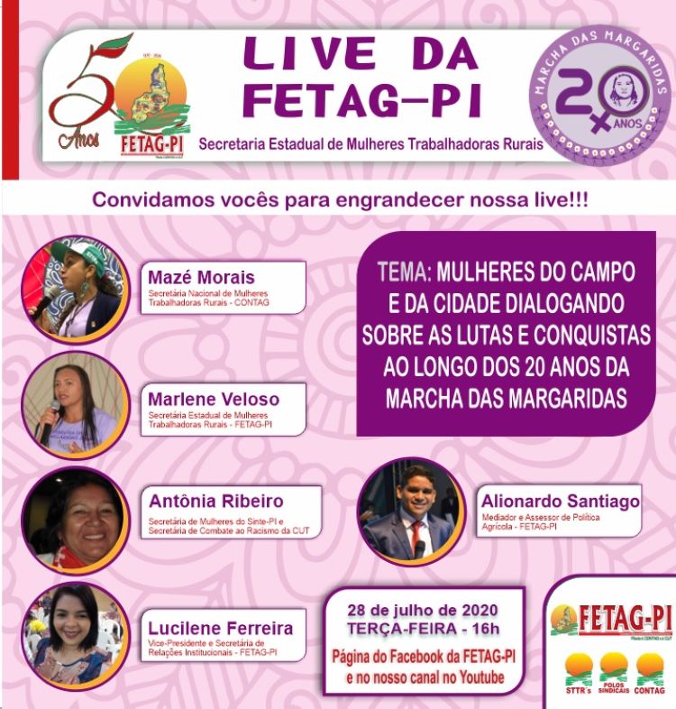 Nesta terça-feira (28/07/2020) a Federação dos Trabalhadores da Agricultura do Piauí (Fetag-PI) realiza um debate com transmissão ao vivo nas redes sociais da Fetag-PI, facebook e Youtube, a partir das 16h.