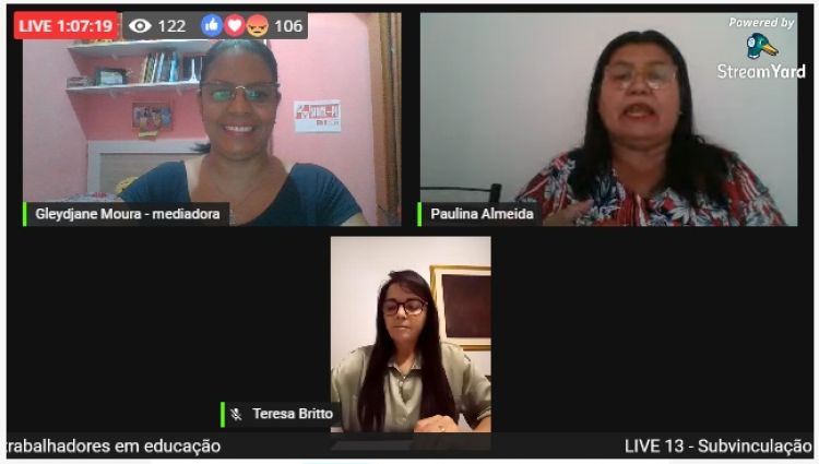 Nesta quarta-feira (29/07), na Live do Sinte-PI o tema em debate foi o precatório do Fundef, a subvinculação e a valorização dos trabalhadores em educação, que contou com a participação da deputada estadual Teresa Brito (PV) e da professora Paulina Almeida, presidente do Sinte-PI. Lamentamos que o deputado Francisco Limma (PT), que confirmou participação, não tenha conseguido entrar no link da transmissão e participar do debate.