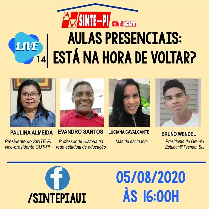 Esperamos você nesta quarta-feira, 05/08/2020, às 16h no facebook/Sintepiaui