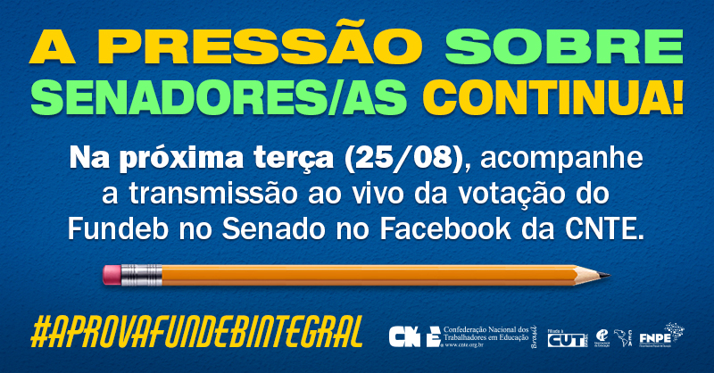 >> Excepcionalmente nesta terça (25) não haverá a Live da CNTE - haverá a transmissão o vivo da votação do Fundeb no Senado na página fb.com/cntebrasil.
