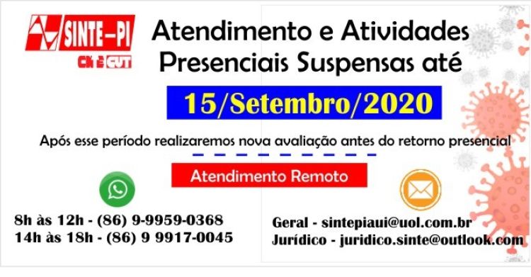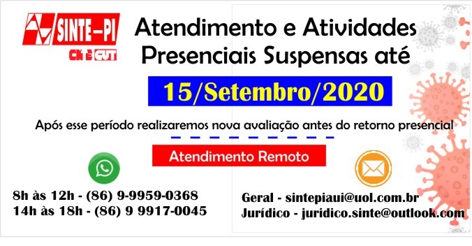 Preocupados com o crescimento do número de casos de COVID-19 no Piauí, a direção do SINTE-PI decidiu manter suspensos o atendimento e atividades presenciais até dia 15 de setembro de 2020, em todas as dependências físicas do SINTE-PI (Escritório, Casa de Hospedagem, Clube Social e Colônia de Férias).