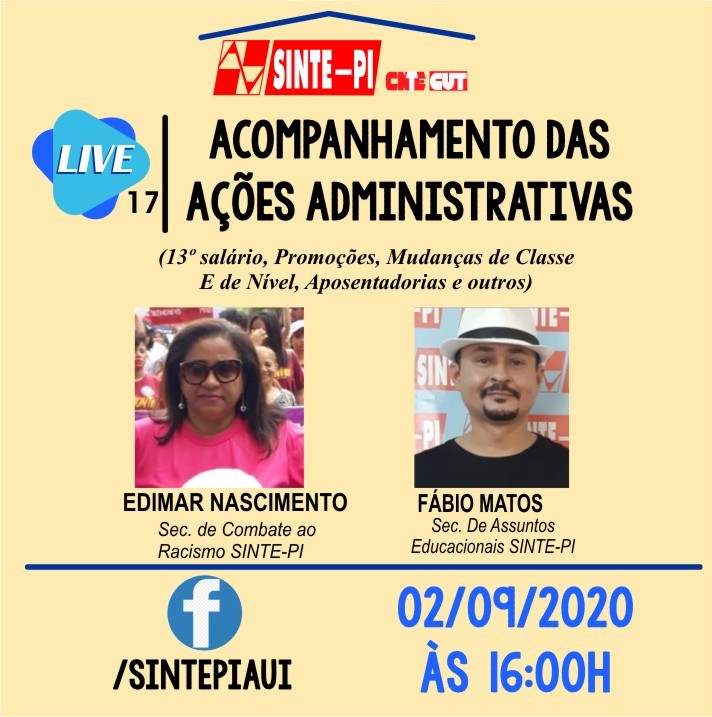 Na Live desta quarta-feira (02) o SINTE-PI trará uma atualização do acompanhamento das atividades administrativas que o sindicato vem realizando junto aos órgãos gestores do estado.