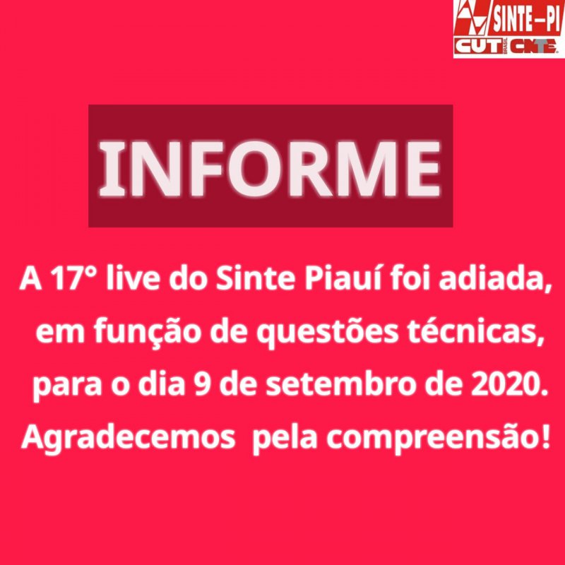 O Sinte Piauí comunica o adiamento da transmissao ao vivo que promoveria nesta quarta-feira (2), em função de problemas técnicos que não foram solucionados em tempo hábil. Agradecemos a compreensão de todos.