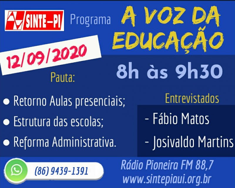 O programa A Voz da Educação é uma produção do SINTE-PI e vai ao AR todo sábado das 8h às 9h30 na Rádio Pioneira de Teresina FM 88,7 (no site ou no aplicativo da rádio) e também pelo aplicativo A Voz da Educação que você pode baixar na PlayStore do seu celular.