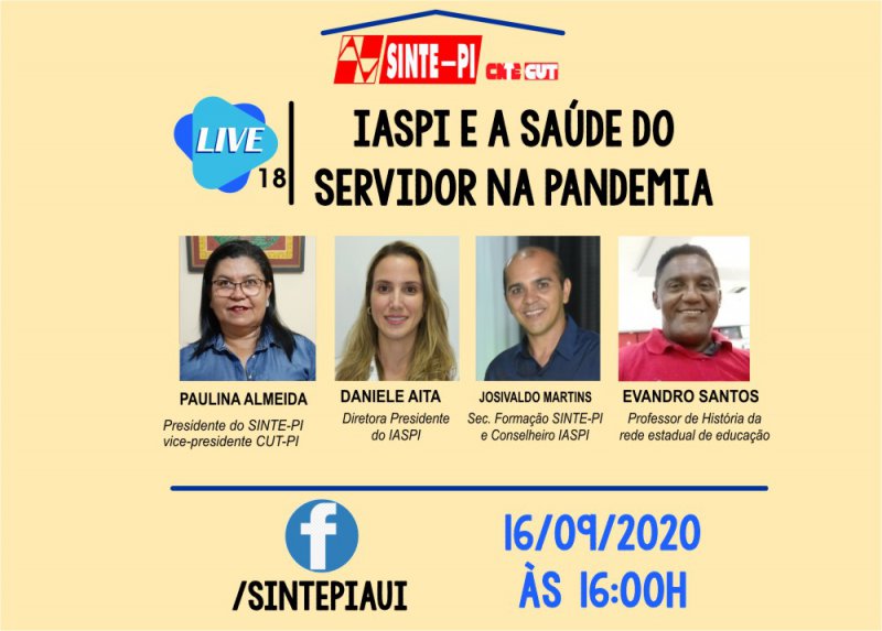 Diante deste cenário, o SINTE-PI realizará mais uma edição da Live do Sinte com transmissão ao vivo para discutir o tema "IASPI e a saúde do servidor na pandemia". A Live acontecerá dia 16 de setembro de 2020, às 16h pelo facebook do Sinte-Piauí.