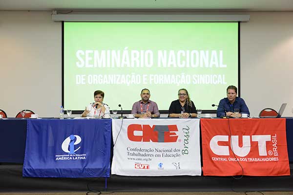 Organização - Inicialmente os representantes de alguns sindicatos apresentaram suas experiências na condução das secretarias de formação das suas entidades: pela APP-Sindicato falou Arnaldo Vicente, pelo SINPRO-DF, Luciana Custódio, pelo SINTEPE-PE, Ivete Caetano de Oliveira e pelo SINDIPEMA-SE, Luciana Ramos de Oliveira Silva. Em todas as falas foram mencionados os seguintes desafios: dificuldade de mobilização e articulação da categoria, dificuldade para renovação de quadros, comunicação eficiente com a base e autonomia na relação sindicato - partido político. Isso demonstra que, apesar das especificidades de cada região e sindicato, as estratégias podem e devem ser pensadas em unidade.