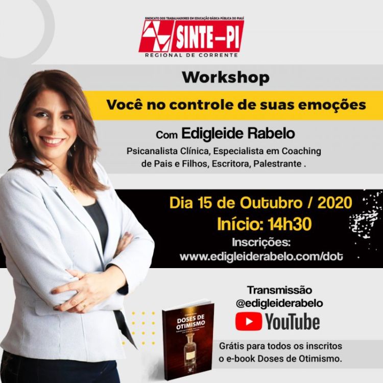 Com o tema: Você no controle de suas emoções", a psicanalista e escritora Edigleide Rabelo fará uma palestra para os trabalhadores em educação da Regional de Corrente.