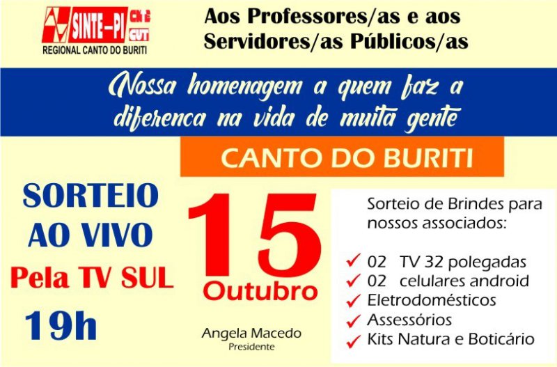 - 15/10 - CANTO DO BURITI - 19h - o sorteio será transmitido ao vivo pela TV SUL.