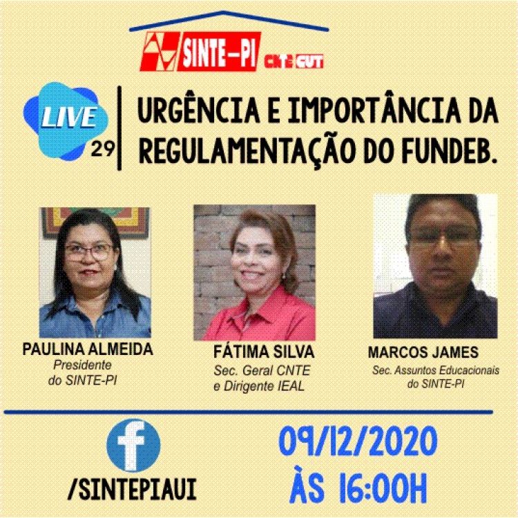 A 29ª transmissão ao vivo do Sinte Piauí tem com tema o processo de aprovação da Lei de Regulamentação do novo FUNDEB, O PL nº 4.372/2020, em palestra da secretaria geral da CNTE, Fátima Silva, com a participação da presidente do Sinte Piauí, Paulina Almeida, e do diretor adjunto da secretária de assuntos educacionais da entidade, Marcos James.