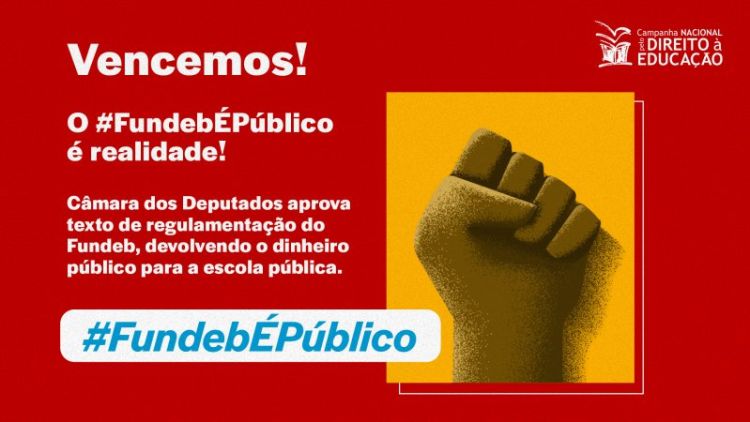 A Campanha Nacional pelo Direito à Educação – maior, mais ampla e mais plural rede em defesa do direito à educação no Brasil – comemora a aprovação do Projeto de Lei de Regulamentação do Fundo de Manutenção e Desenvolvimento da Educação Básica e Valorização dos Profissionais da Educação - Fundeb, em votação final na Câmara dos Deputados.