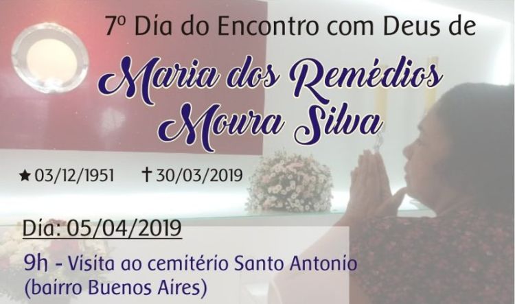 A família da Professora Maria dos Remédios Moura Silva, consternada com o seu traspasse, convida parentes e amigos para a missa de sétimo dia em intenção de sua alma, a ser celebrada sexta-feira (5/4/2019), às 19h, na Igreja Imaculada Conceição, situada na Travessa Crato, 50, Aeroporto.