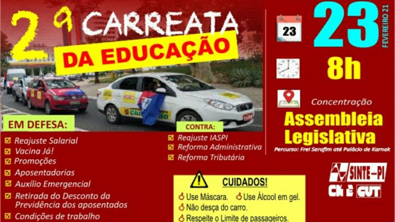 SINTE convoca todos os trabalhadores em educação para a 2a Carreata da Educação será dia 23/02, com concentração às 8h na Assembleia Legislativa do Piauí.
