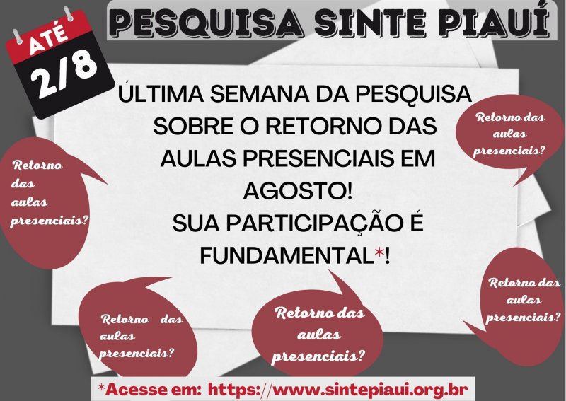 O Sinte Piauí promove, até o dia 2 de agosto de 2021, uma pesquisa abrangendo os trabalhadores e as trabalhadoras em Educação da rede estadual de ensino para que opinem sobre o retorno das aulas na modalidade presencial no referido mês.