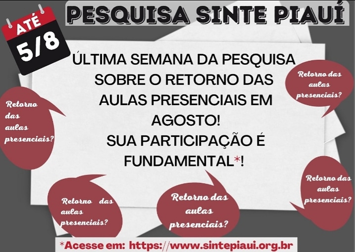 Atendendo a solicitação da categoria, o Sinte Piauí prorrogou, até a próxima quinta-feira (5), o prazo para que os trabalhadores e as trabalhadoras da rede estadual de ensino opinem sobre o retorno das aulas na modalidade presencial no cenário atual da pandemia e do processo de imunização.