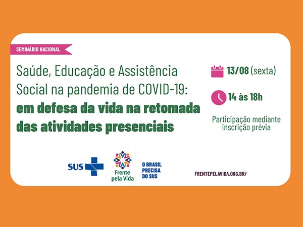 Com o argumento da queda do número de internações e óbitos – mesmo que ainda em índices elevados – 24 das 27 redes estaduais decretaram pela retomada das atividades presenciais em agosto, com o aval do governo federal. Diante desse cenário, a ação intersetorial é mais do importante: é fundamental para preservar a comunidade escolar e salvar vidas. Para potencializar essa ação, as entidades da Frente Pela Vida convidam todos para assistir e participar do Seminário Saúde, Educação e Assistência Social na pandemia de COVID-19: em defesa da vida na retomada das atividades presenciais na próxima sexta, 13 de agosto, a partir das 14 horas.