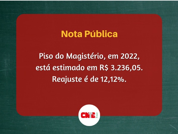Depois do calote do governo federal que anulou o reajuste do piso salarial profissional nacional do magistério, neste ano de 2021(inicialmente previsto em 5,89%), agora, a nova previsão de reajuste para os menores vencimentos de carreira do magistério, vinculados à formação Normal de nível médio, é de 12,12%. E o valor do Piso poderá ser de R$ 3.236,05, a partir de 1º de janeiro de 2022.