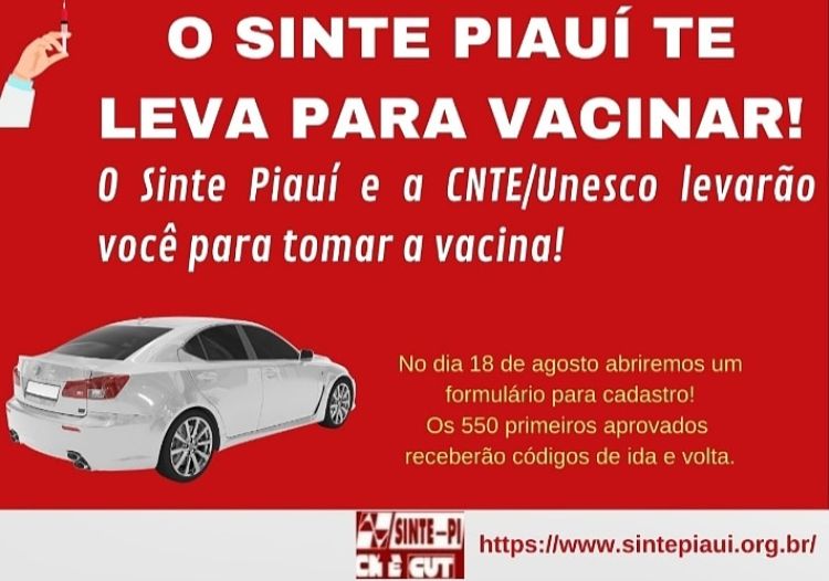 O Sinte Piauí, a CNTE e a Unesco levarão os/as filiados/as ao Sindicato para tomar vacina! Indo e voltando! Serão 1.100 trajetos de UBER presenteados para a categoria, indo e voltando, com 550 contemplados/as. Esta ação é resultado de um convênio entre a UNESCO e a CNTE para os sindicatos do Norte e Nordeste. Confira as regras e preencha o formulário.
