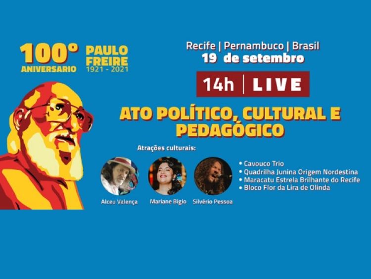 O centenário do educador pernambucano Paulo Freire, que em 19 de setembro de 2021 completaria 100 anos, será comemorado virtualmente com muita alegria e cultura popular. Uma dezena de instituições do movimento educacional brasileiro e internacional promovem, nos dias 19 e 20 de setembro, o 100º Aniversário de Paulo Freire em evento virtual. A live será composta de ato político, pedagógico e cultural, com a apresentação do cantor pernambucano Alceu Valença, às 18h do dia 19.