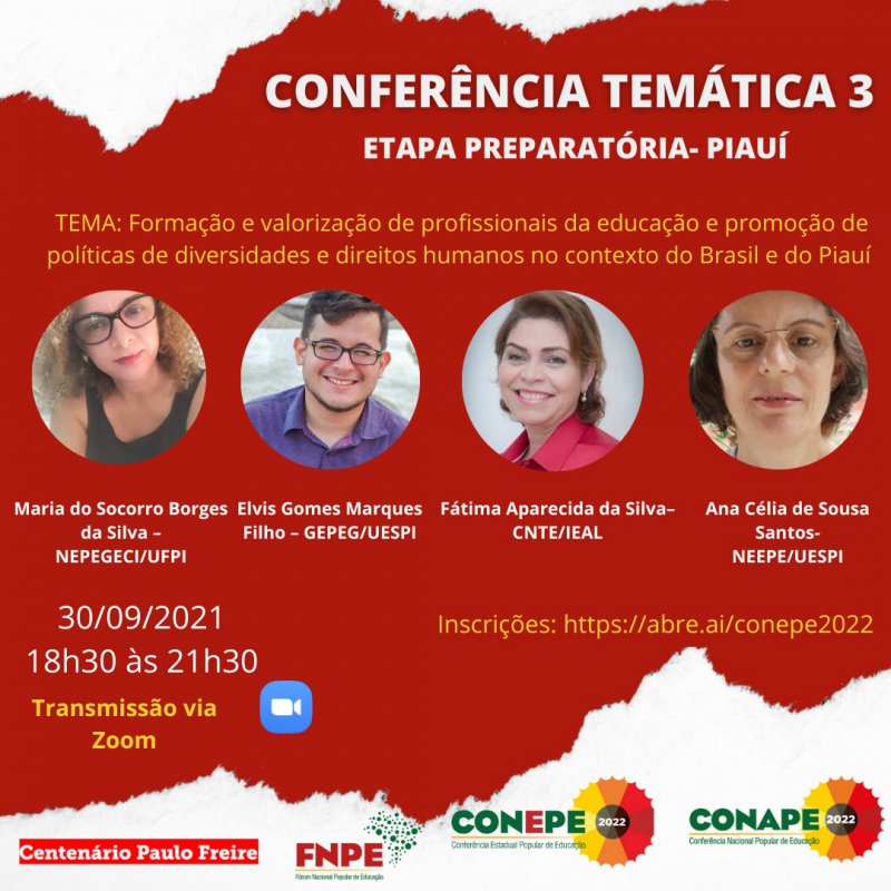 Diversas entidades, movimentos sociais, núcleos de pesquisas, fóruns em defesa da educação e sindicatos da educação, entre os quais o Sinte Piauí, promovem, na próxima quinta-feira (30), a partir das 18h30, a terceira e última Conferência Temática preparatória para a Conferência Estadual Popular de Educação do Estado do Piauí (CONEPE PI). Assista em: https://www.youtube.com/watch?v=VMHjlDx7pWA