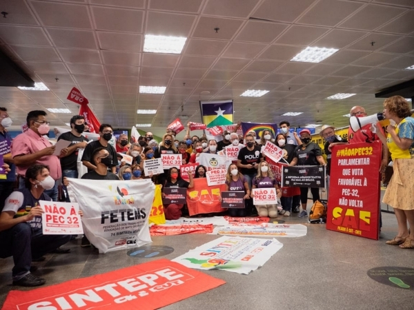Servidores municipais, estaduais e federais lotaram o Aeroporto de Brasília na manhã desta terça-feira (19) para pressionar deputados e deputadas a votarem contra a Proposta de Emenda à Constituição (PEC) 32, mais conhecida como Reforma Administrativa.