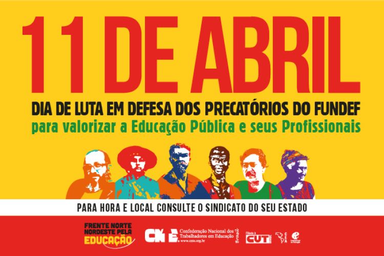 Neste dia 11, a Confederação Nacional dos Trabalhadores em Educação – CNTE e a Frente Norte e Nordeste em Defesa da Educação realizam o Dia D pela subvinculação dos precatórios do Fundef para a educação e seus profissionais.