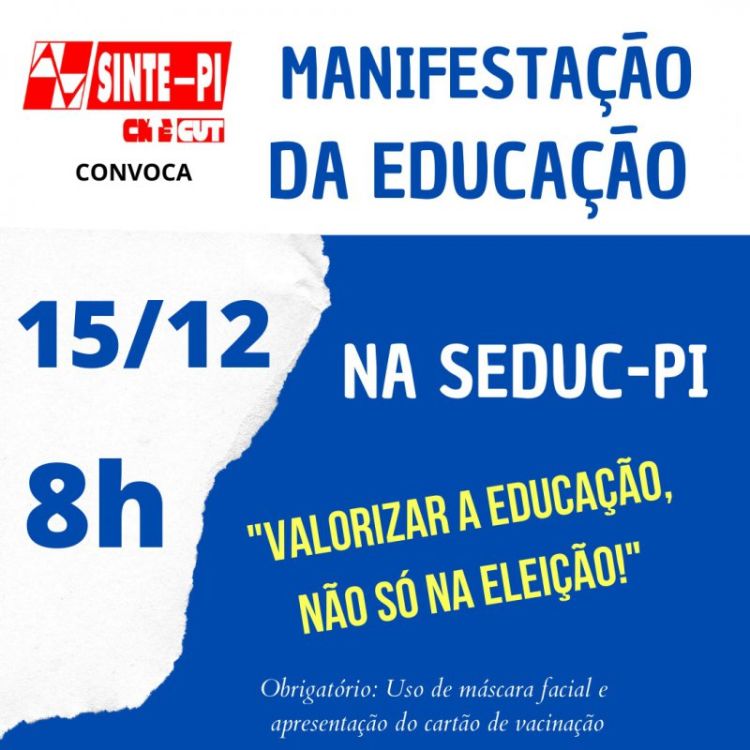 O Sinte Piauí convoca a categoria para a Manifestação na Seduc, no dia 15 de dezembro, a partir das 8h, na luta pela valorização profissional e pelo rateio do abono do Fundeb.