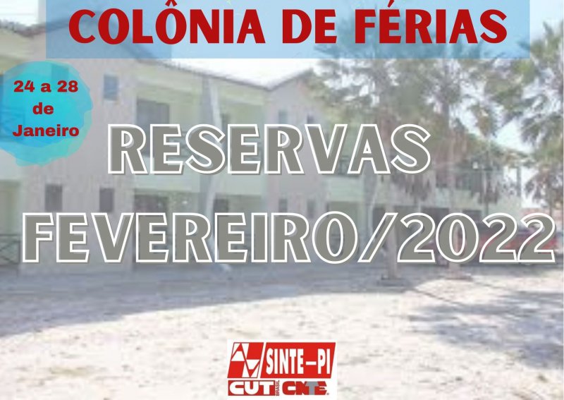 As reservas da Colônia de Férias do Sinte Piauí para o mês de fevereiro/2022 podem ser realizadas, somente pelos/as sócios/as titulares, do dia 24 de janeiro até o dia 28 de janeiro, através do e-mail: sintefinanceiro@gmail.com