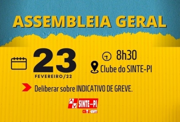 A presidenta do Sinte Piauí, Paulina Almeida, renova a convocação para que as trabalhadoras e os trabalhadores em educação da rede estadual participem da Assembleia Geral com indicativo de greve, que será realizada nesta quarta-feira (23), a partir das 8h30, na sede social do sindicato.