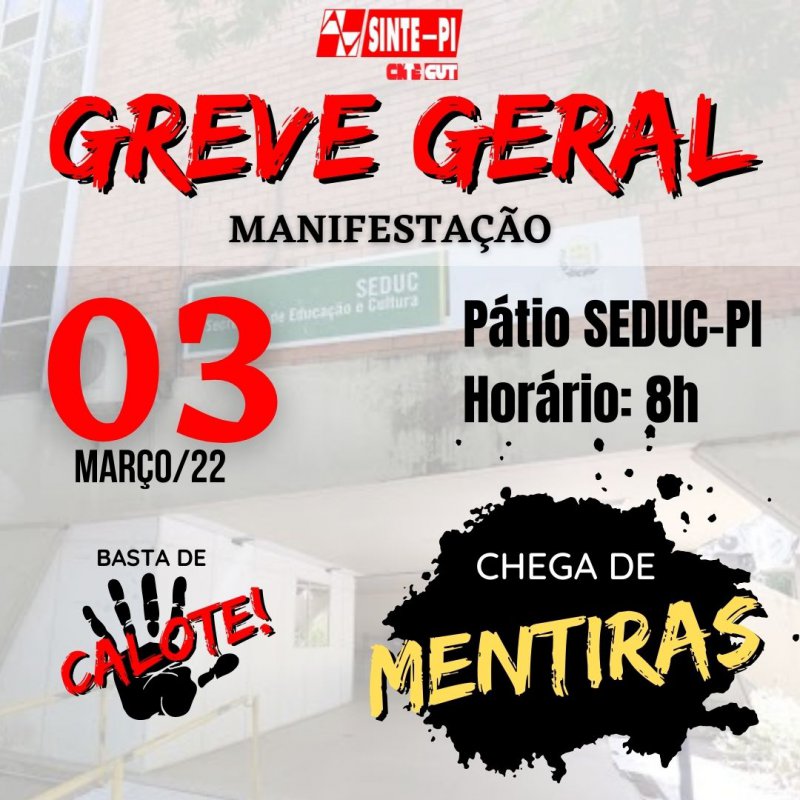 O Sinte Piauí renova a convocação para que a categoria compareça em peso na manifestação que será realizada no pátio da Seduc, no dia 3 de março, a partir das 8h30.
