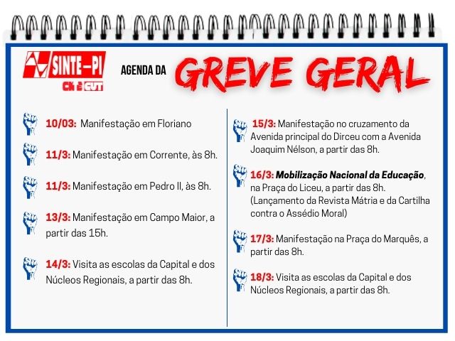 O Sinte Piauí e os trabalhadores e trabalhadoras em educação da rede estadual divulgam as mobilizações e ações que pontuam a greve geral da categoria na próxima semana. Aos que apostam no nosso cansaço e desgaste, respondemos que apostamos na força e na união da classe trabalhadora.