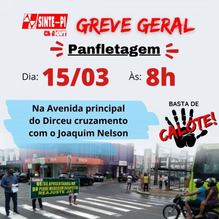 Nesta terça-feira (15), o Sinte Piauí e os trabalhadores e trabalhadoras da rede estadual de educação registrarão o 21º dia da greve geral da categoria, com mais uma grande panfletagem no bairro do Dirceu, em Teresina, no cruzamento entre a Avenida Principal e a Avenida Joaquim Nélson, a partir das 8h.