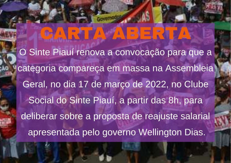 Em Carta Aberta à população, o Sinte refuta o discurso de palanque, falacioso do governo Wellington Dias, que afirma que já paga o Piso Nacional para os trabalhadores da rede estadual de educação, colocando, de forma mentirosa, a proposta apresentada pela secretaria estadual de Administração, na reunião com o sindicato no última segunda-feira (14), como sendo um avanço.