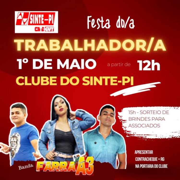 Neste domingo, 1º de maio, o Sinte Piauí homenageará a classe trabalhadora, com um recorte especial direcionado aos trabalhadores e trabalhadoras da rede estadual de educação, promovendo um show com a Banda Farra A3, a partir das 12h, no Clube Social e um sorteio de brindes, às 15h, somente para os filiados que apresentarem contracheque do mês de abril e documento de identidade com foto.