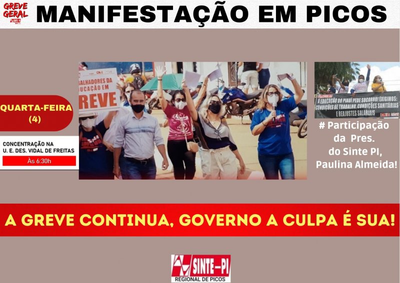 Nesta quarta-feira (4), o Sinte Picos promove uma grande manifestação, com concentração na U.E. Des. Vidal de Freitas, a partir das 6h30, mobilizando a categoria na defesa da valorização profissional e do pagamento dos reajustes salariais dos anos de 2019,2020 e 2022 devidos pelos governos Wellington Dias/ Regina Sousa as/aos profissionais da rede estadual de educação. O evento será reforçado com a presença da presidente do Sinte Piauí, Paulina Almeida, e de outras/os integrantes da direção estadual do sindicato.