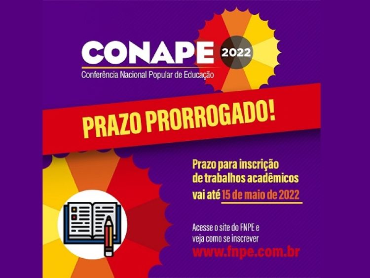 O prazo para inscrição de trabalhos acadêmicos na Conferência Nacional Popular da Educação (CONAPE) – modalidade Comunicação Oral – foi prorrogado para o dia 15/05/22. A CONAPE será realizada em Natal nos dias 15, 15 e 17 de julho de 2022. A programação do evento inclui sessões de apresentação de trabalhos na modalidade Comunicação Oral, tendo por base os eixos temáticos e a temática geral da CONAPE 2022 “Reconstruir o País: a retomada do Estado democrático de direito e a defesa da educação pública e popular, com gestão pública, gratuita, democrática, laica, inclusiva e de qualidade social para todos/as/es”. O Lema é “Educação pública e popular se constrói com democracia e participação social: nenhum direito a menos e em defesa do legado de Paulo Freire”.