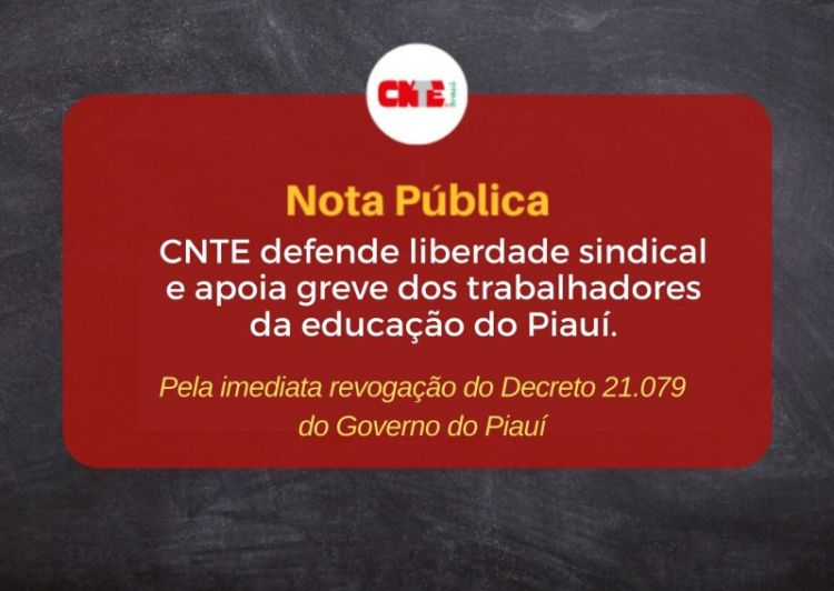 A Confederação Nacional dos Trabalhadores em Educação (CNTE) divulgou Nota Pública em defesa da liberdade sindical como um direito dos/as trabalhadores/as e base da democracia, e que não pode ser fragilizada. A entidade se posiciona contrária à atitude autoritária da governadora Regina Sousa (PT), que deveria ser um governo do campo democrático, ao publicar o Decreto 21.079 de 19/maio/2022 assediando os servidores com corte de ponto, descontos nos salários, multa ao Sindicato da educação dentre outras coisas. Dessa forma, o governo do Piauí se iguala a outros direita e de índole antidemocráticas.