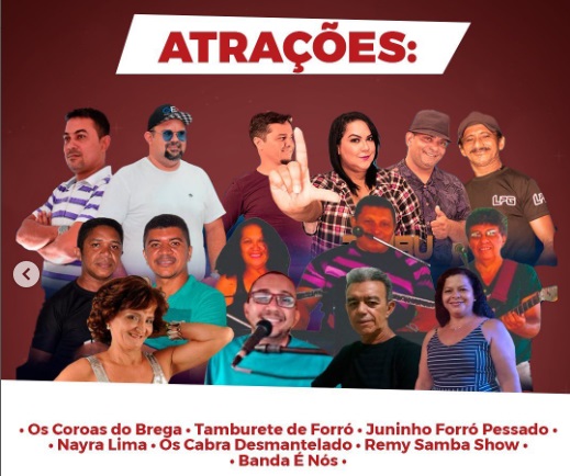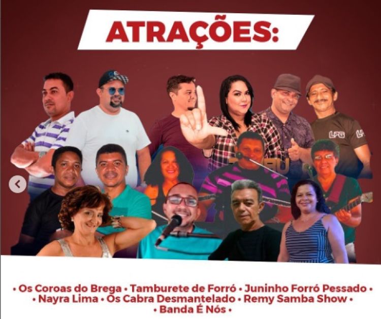 Atrações: Os Coroas do Brega, Tamburete de Forró, Juninho Forró Pesado, Nayra lima, Os Cabra Desmantelado, Remy Samba show e Banda É Nós.
