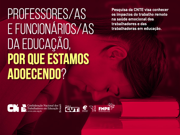 Ansiedade, depressão e desesperança estão entre os distúrbios que acometem professores/as e funcionários/as da educação. A constatação faz parte do estudo “Novas formas de trabalhar, novos modos de adoecer”, realizado com 714 trabalhadores da educação, divulgado no fim de 2021, pela Confederação Nacional dos Trabalhadores em Educação (CNTE). Com base na pesquisa, o Coletivo de Saúde da CNTE lançou uma campanha nas redes sociais como forma de alerta e combate aos causadores dos danos físicos, psicológicos e sociais que acometem os/as trabalhadores/as.