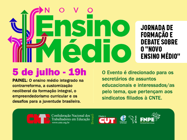 A Confederação Nacional dos Trabalhadores em Educação (CNTE) promove na próxima terça (5), às 19h, o segundo painel da Jornada de Formação e Debate sobre o "Novo Ensino Médio". O evento será realizado online pela plataforma Zoom. O tema dessa edição será: "O ensino médio integrado na contrarreforma, a customização neoliberal da formação integral, o empreendedorismo curricular e os desafios para a juventude brasileira".