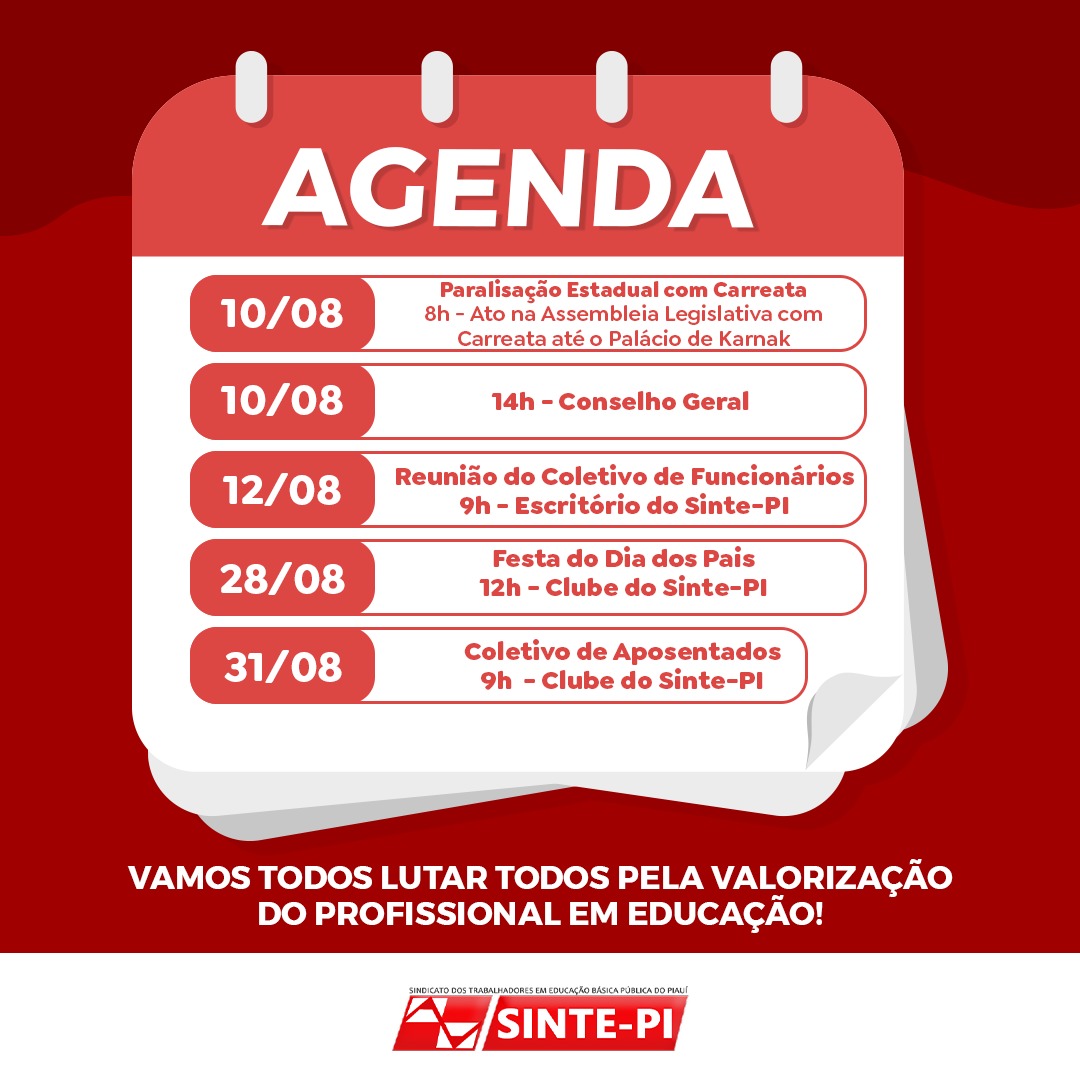 Dentro das mobilizações da campanha salarial dos trabalhadores em educação, o Sinte-PI divulga a agenda de atividades para este mês de Agosto.
