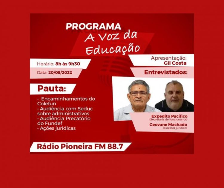 O programa vai ao AR todo sábado, das 8h às 9h30, pela Rádio Pioneira de Teresina FM 88,7 (www.radiopioneirathe.com) ou pela rádioweb do sinte pelos endereços: www.sintepiaui.org.br ou www.avozdaeducacao.com