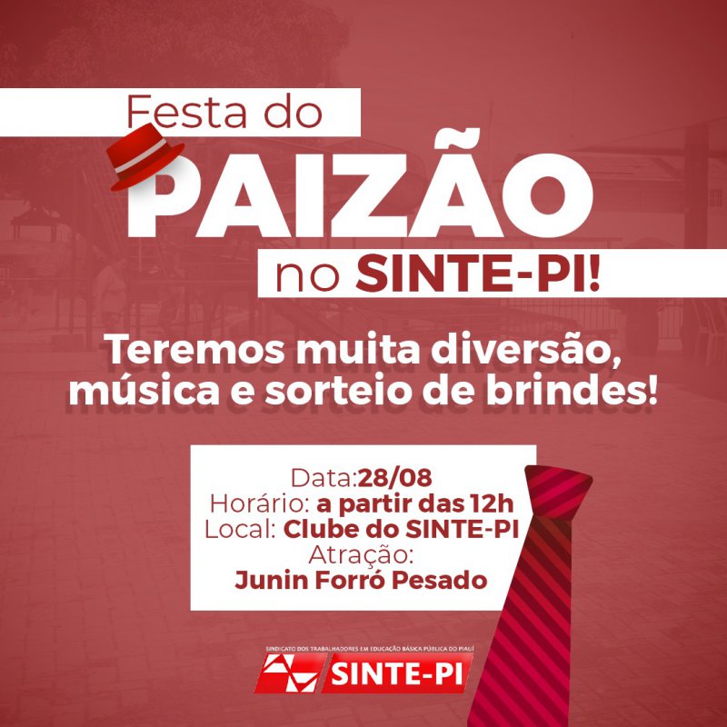 A comemoração será realizada neste domingo, dia 28 de agosto, a partir das 12h, no Clube Social do Sinte-PI. Teremos manhã de lazer, parque aquático, quadra esportiva, playground, música ao vivo e sorteio de brindes. A animação vai ficar por conta da banda Junin Forró Pesado.