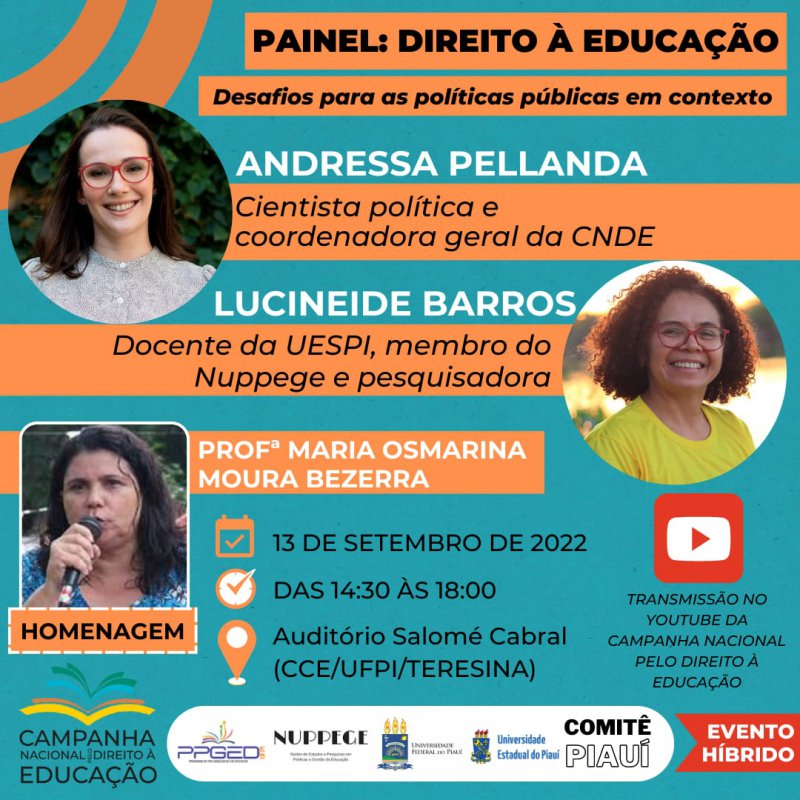 No dia 13 de setembro, Andressa Pellanda participa do painel “Direito à Educação - Desafios Para as Políticas Públicas em Contexto”, no auditório do Centro de Ciências da Educação (CCE) da Universidade Federal do Piauí (UFPI). O evento acontece das 14h30 às 18h, em formato híbrido. Para participar é necessário fazer a inscrição através do link: https://forms.gle/KY39cbC2dutBFPfh6