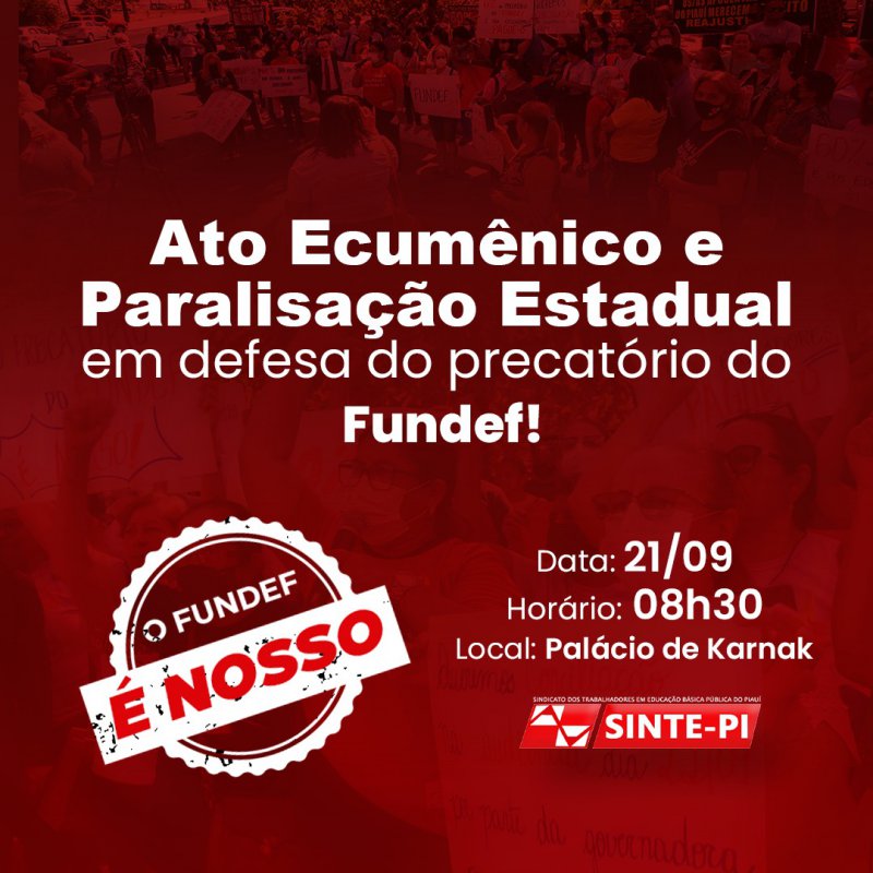Seguindo a agenda de mobilização e luta pelo pagamento dos 60% do precatório do Fundef aos profissionais da educação, o Sinte-PI convoca todos os trabalhadores e trabalhadoras para Paralisação Estadual nesta quarta-feira (21/09) com Ato ecumênico em frente ao Palácio de Karnak a partir das 8h30.