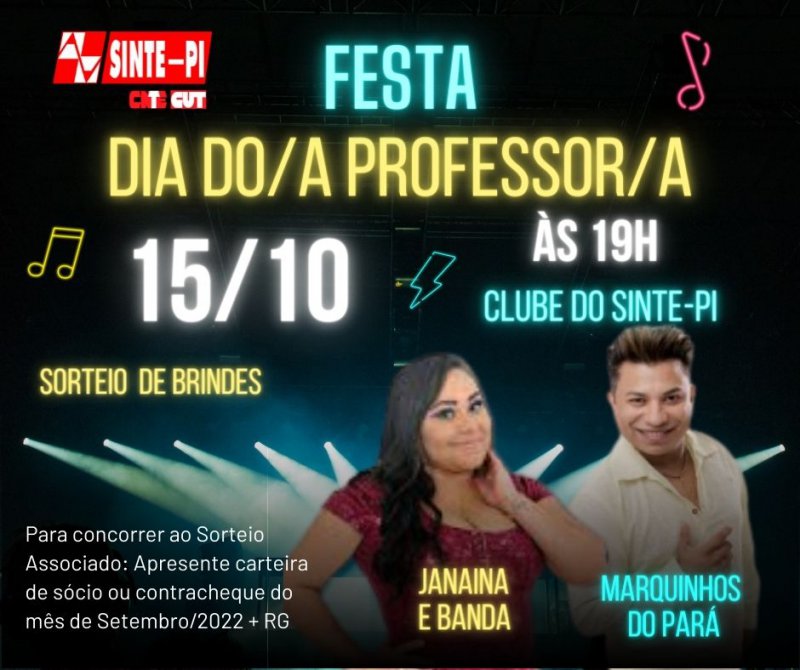 O SINTE-PI está com tudo preparado para a tradicional festa em homenagem ao dia do/a professor/a, dia 15 de outubro.