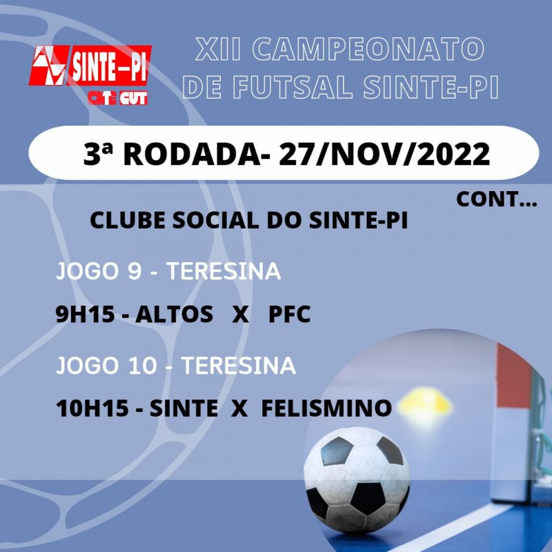 Dando continuidade à 3ª rodada do XII Campeonato de Futsal do SINTE-PI teremos jogos neste domingo dia 27 de novembro a partir das 9:15 com o 1º jogo ALTOS X PFC e às 10:15 - SINTE-PI X FELISMINO.