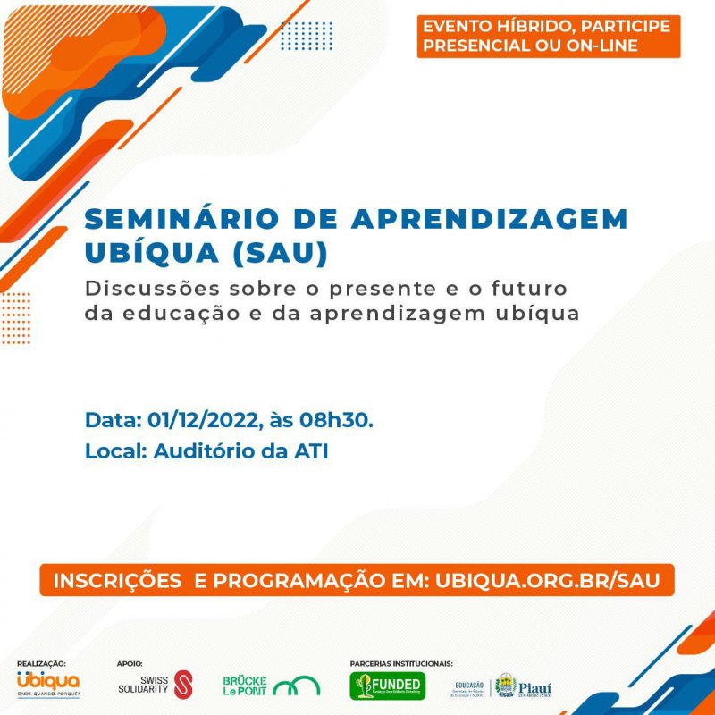 Estão abertas as inscrições para o Seminário de Aprendizagem Ubíqua (SAU), realizado pelo Instituto Ubíqua, em parceria com a Brucke Le Pont e Swiss Solidarity e com o apoio da SEDUC/Governo do Piauí e Fundação Dom Edilberto Dinkelborg.