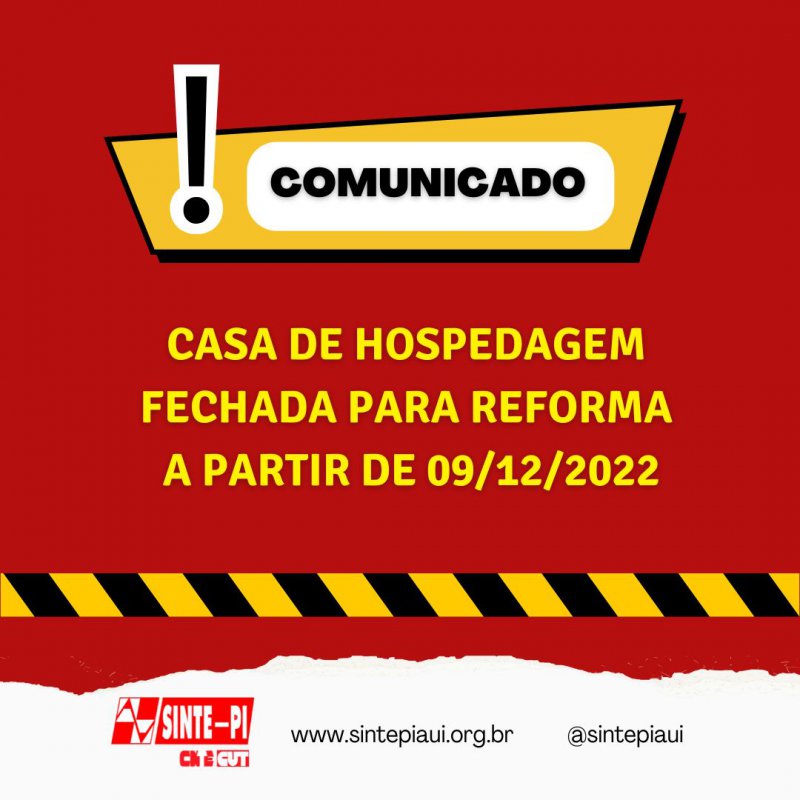 A direção do SINTE-PI comunica aos seus associados e associadas que a Casa de Hospedagem será fechada para reforma e sanitização a partir do dia 09 de dezembro de 2022.