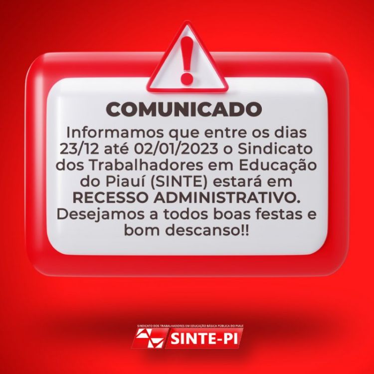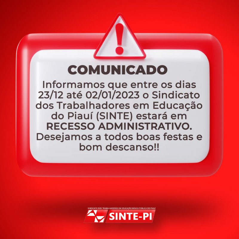 Recesso Administrativo | Sinte-PI encerras suas atividades em 23/12/2022 e retorna em 02/01/2023